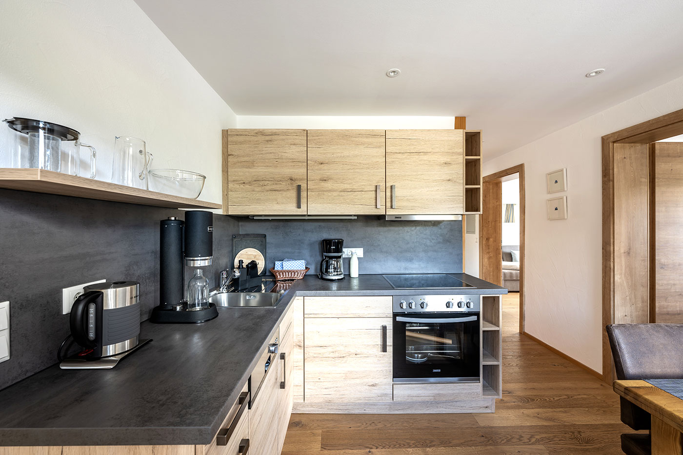 Das großzügig geschnittene Apartment befindet sich im ersten Obergeschoß. Es verfügt über ein Schlafzimmer mit gemütlichem Doppelbett sowie ein Schlafzimmer mit einem Stockbett, bestens für Kinder geeignet. Zudem kann man sich auf der komfortablen Couch mit Ottomane im Wohnzimmer entspannen. Das moderne Badezimmer mit begehbarer Dusche genügt höchsten Ansprüchen. Die Küche ist voll ausgestattet und vereint mit einem gemütlichen Eichentisch, handgefertigter Holzbank und Lederstühlen Komfort und Behaglichkeit. Die Wohnfläche beträgt ca. 60 qm. Dazu kommt ein ca. 11 qm großer Balkon Richtung Süden, auf dem Sie den Blick auf das atemberaubende Bergpanorama genießen können.